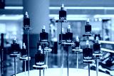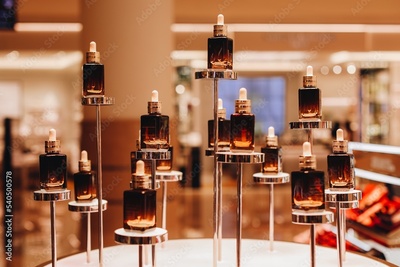 A glass brown bottles of serum for face on a gold stand. Cosmetic concept. Skincare products , beauty concept