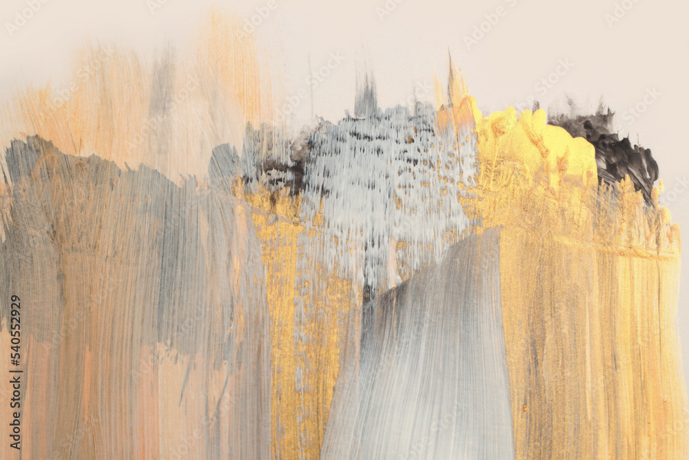 Art modern oil and acrylic smear blot canvas painting wall. Abstract texture gold, bronze, black and white color stain brushstroke texture background.