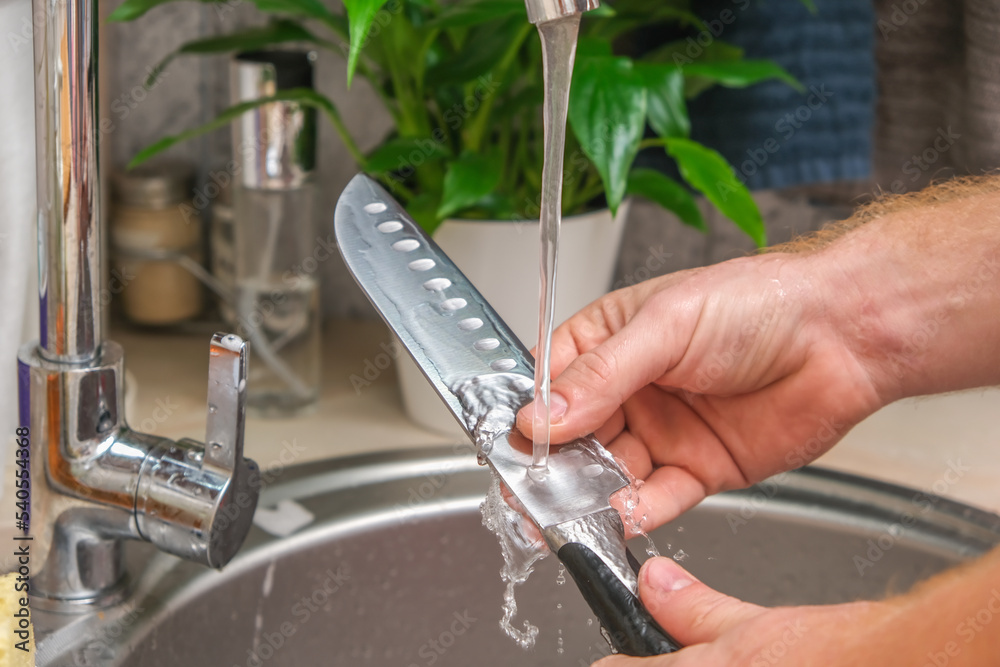 A man washes a sharp steel dirty kitchen knife with a sponge with detergent in the kitchen sink under running water. Gentle hand washing of the kitchen knife. Cleaning of dirty sharp metal products.