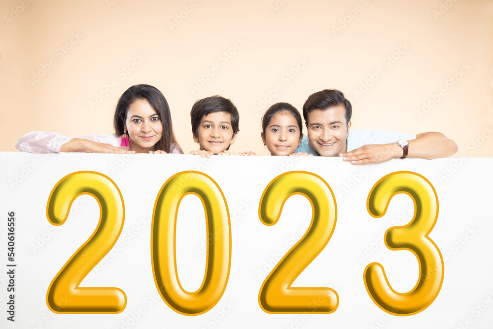Happy new year concept, Young Smiling indian asian family showing number 2023 in isolated on beige background,