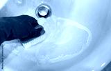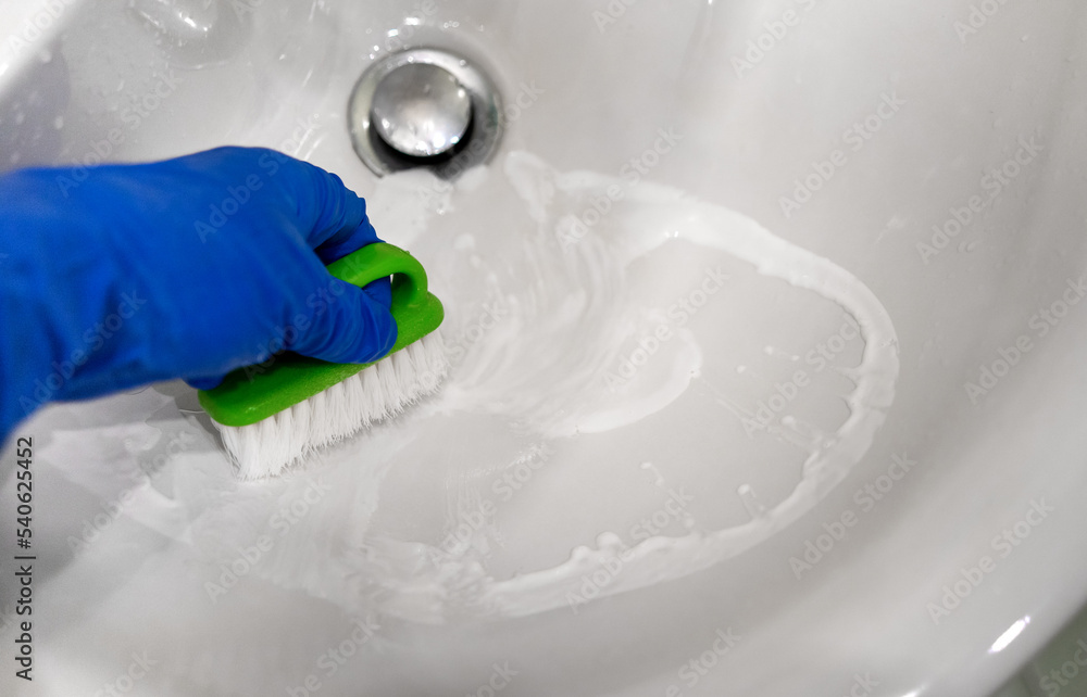 A gloved hand with a counter washes a white sink. Washing the bath with white gel. Cleaning of earthenware in the bathroom.Cleaning of the apartment. Cleaning service.