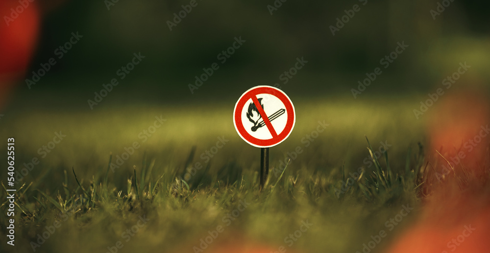 Round forbidding sign with a match in the forest. It is forbidden to make a fire. Danger of forest fire.