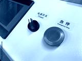 A big red stop button on a metal machine in the workshop. Green equipment start button. Two emergency buttons on the panel.