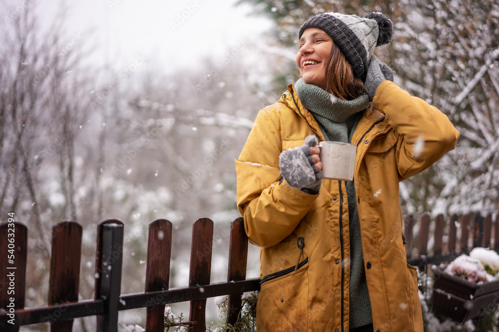 Young happy adult caucasian woman smiling in hat and yellow jacket enjoying tea in a mug with snowfall on the terrace of a country house