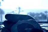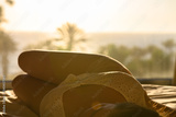 Beautiful woman in nightgown lying on the bed against sea and palm trees at summer sunny day