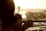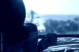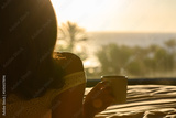 Beautiful woman in nightgown with cup of coffee lying on the bed against sea and palm trees at summer sunny day