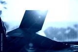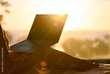Woman freelancer with laptop sitting on the bed in bedroom opposite panoramic window with view on palm tree sea beach at sunset