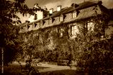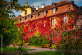 The autumn scenery of the park in Gdansk with a wall covered with red ivy leaves. Poland