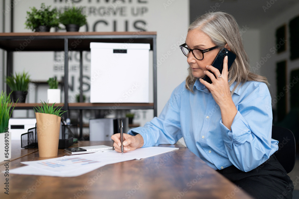 adult business woman working in office talking on mobile phone. Business Invoice Tax Management concept