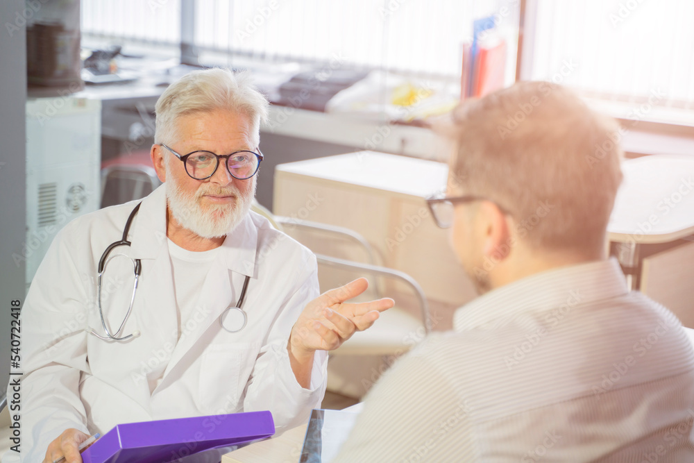an elderly gray-haired male doctor in a medical office consults a male patient