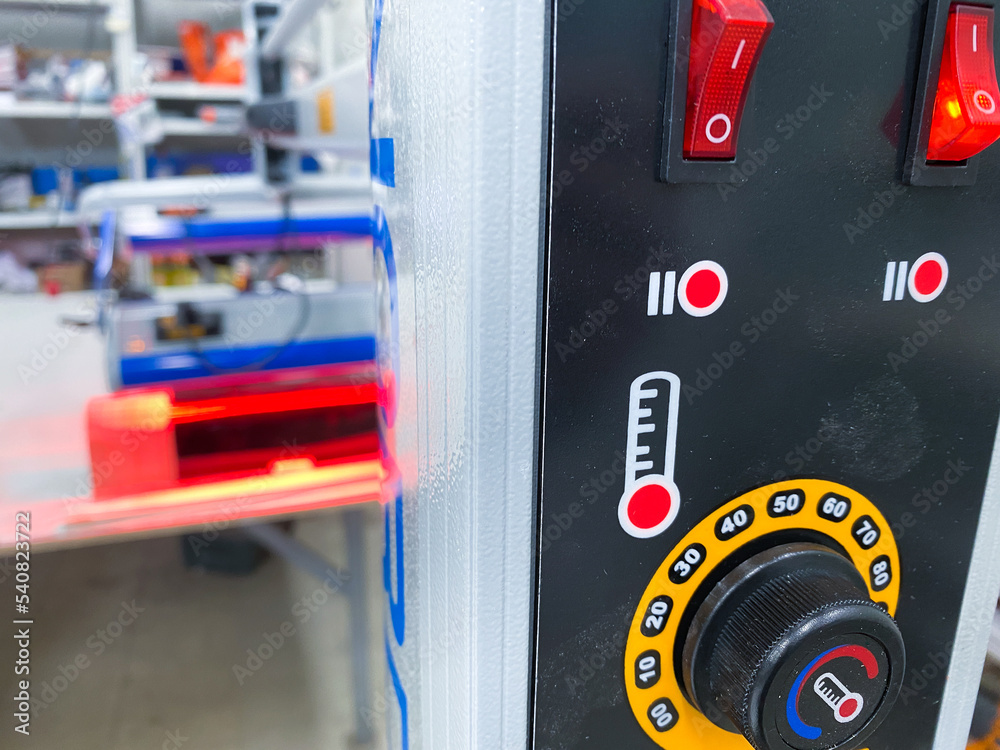 The control panel of the heating station for drying paint. A device for drying after painting the car. Temperature buttons on the panel.
