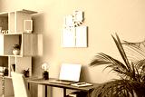 Cozy interior of modern workplace with laptop and family tree photo frame