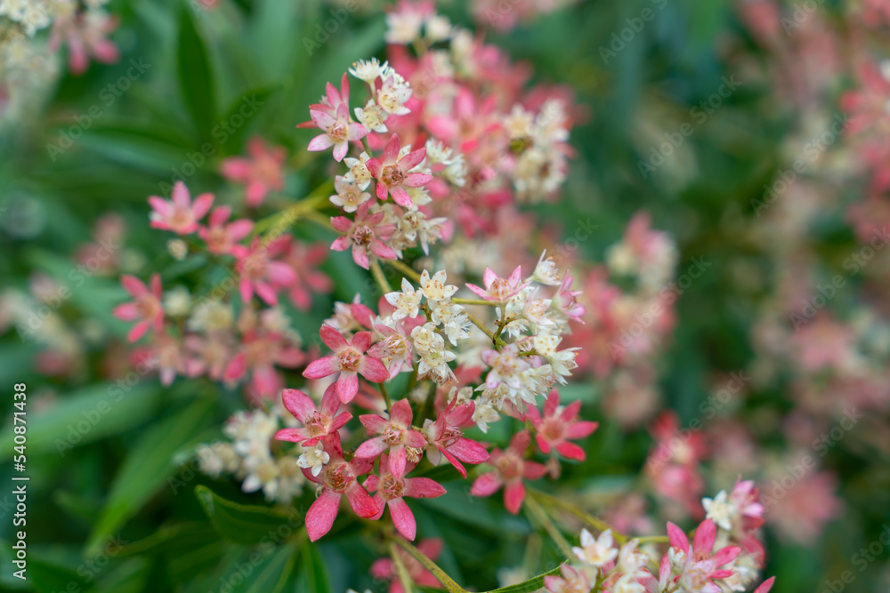 Clusters of pink and white flowers. Closeup. Ceratopetalum gummiferum. New South Wales Christmas Bush.