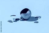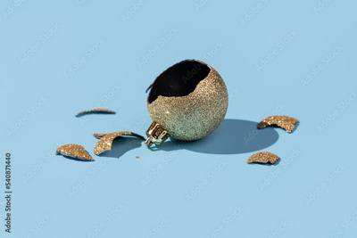 Broken New Year's golden ball. Christmas decorations, blue background. Studio shot, copy space.