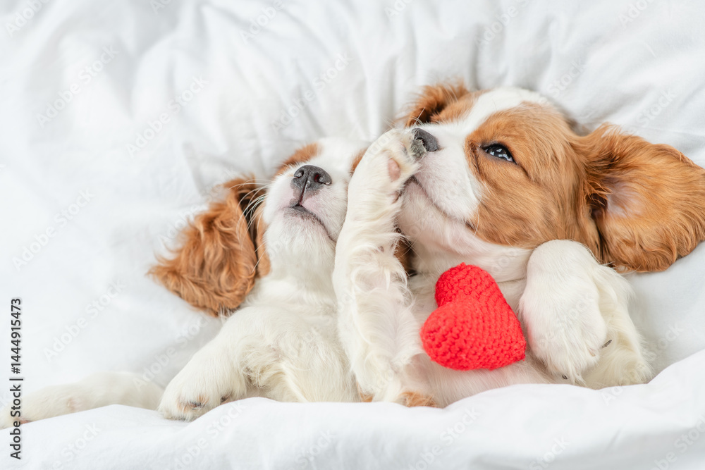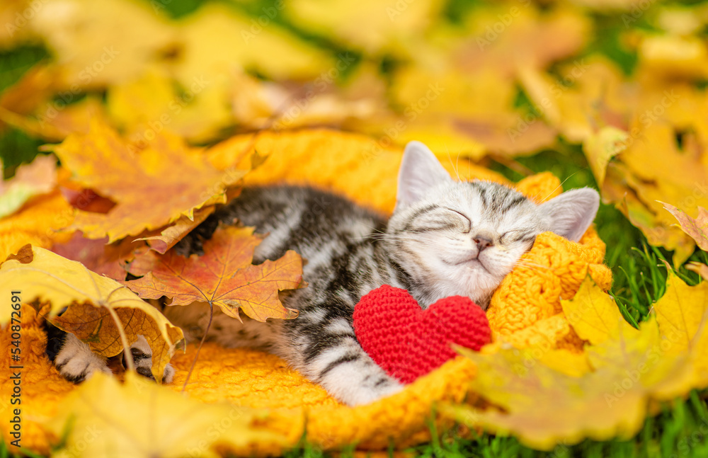 Happy Kitten sleeps on autumn fall foliage and hugs red heart