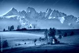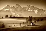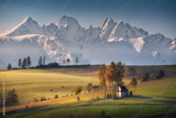 The chapel in Kacwin against the backdrop of the winter Tatra Mountains panorama. Autumn, Poland.