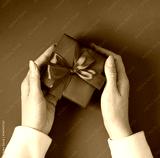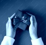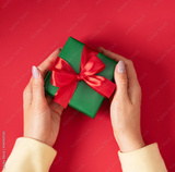 Woman hands holding Christmas present. Gift box wrapped in green paper with red ribbon.