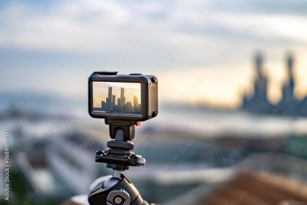 Portrait isolated cutout studio shot of Millennial Asian female elegant fashion model in black casual fashionable fur suit standing posing look at camera on gray background