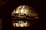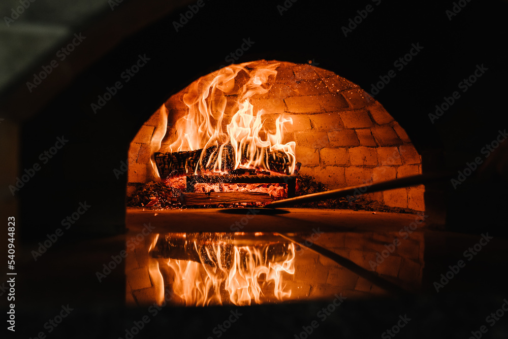 A traditional oven for cooking and baking pizza with a shovel. Firewood burning in the oven. Wood-fired oven. Image of a brick pizza oven with fire.