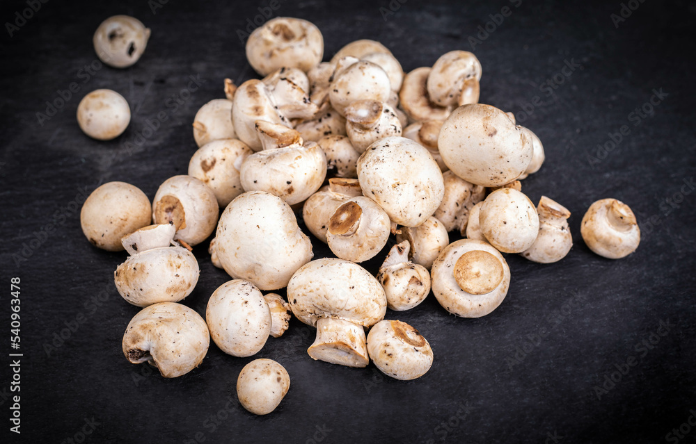 Champignon mushrooms on a black stone background, a kitchen counter, horizontal photo.