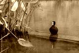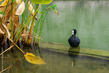 Łyska ptak wodny, zbliżenie. Czarny ptak siedzi na betonowym murku w wodzie.