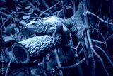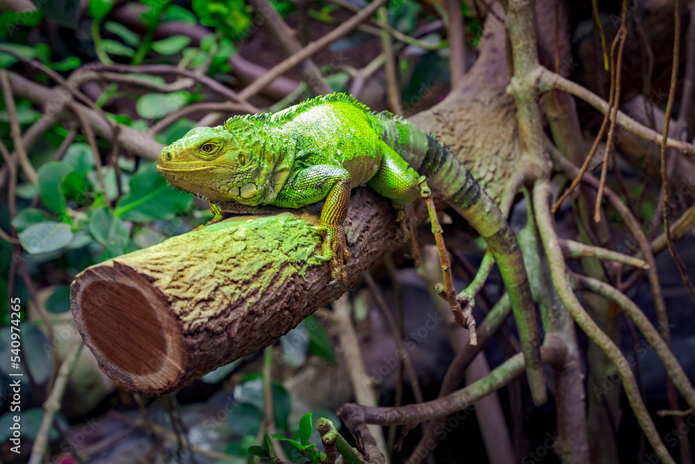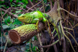 Legwan zielony, zbliżenie. Jaszczurka siedzi na grubej gałęzi drzewa.