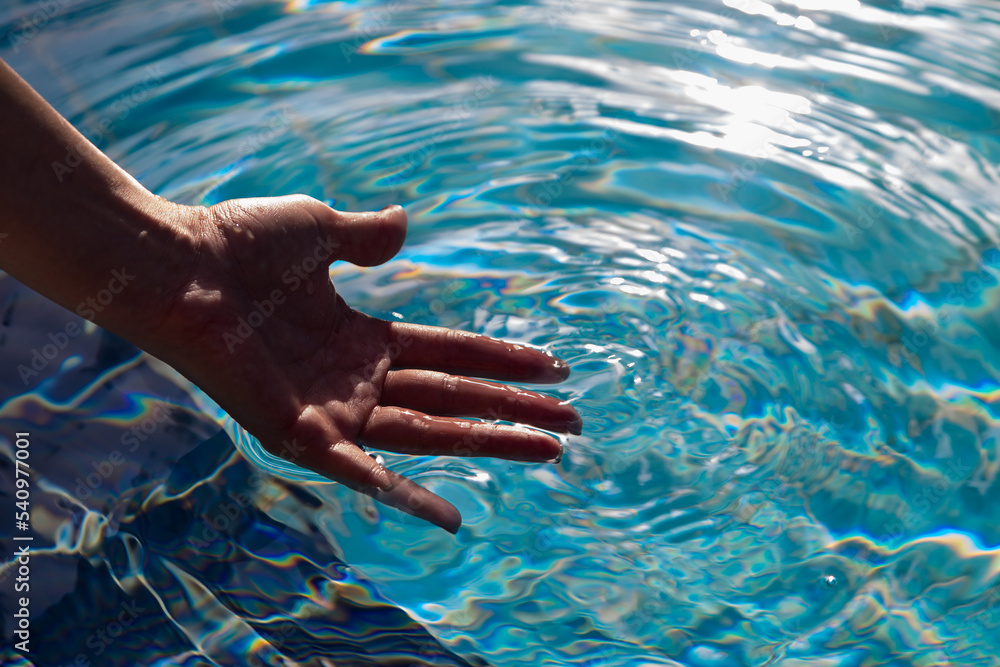 Man's hand inclear transparent water of pool.