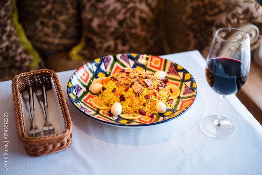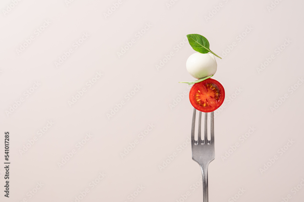 Fork with tomato, mozzarella cheese and basil. Caprese salad on fork close up view. Italian food concept