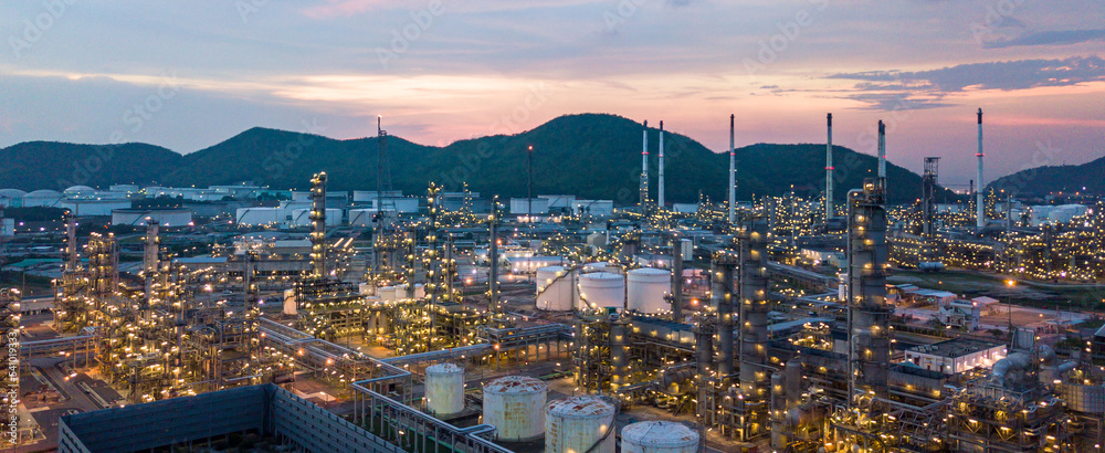 Aerial view oil storage tank and oil refinery factory plant at night form industry zone, Oil refinery and petrochemical plant factory at night, Business oil and gas industrial factory power and energy