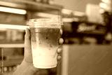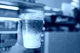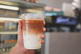Close up of Hand holding a glass of Iced latte with two layer in coffee shop or cafe. Concept of promoted coffee shop or cafe with copy space and wide screen, banner.