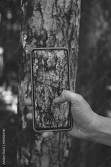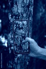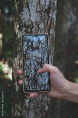 Close up of hand taking photo of tree by Mobile phone, smart phone. Concept of capture or snapshot the environment, memory of journey and traveler. Spending time amoung nature. Natural healing.