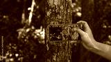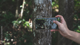 Close up of hand taking photo of tree by Mobile phone, smart phone. Concept of capture the environment, memory of journey and traveler. Spending time amoung nature. Wide screen with copy space.