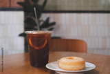 An Iced lemon americano or black coffee and a piece of sugar donut on white plate in coffee shop. Concept of Homemade sweet and dessert, coffee break at afternoon time, photo for promoting coffee shop