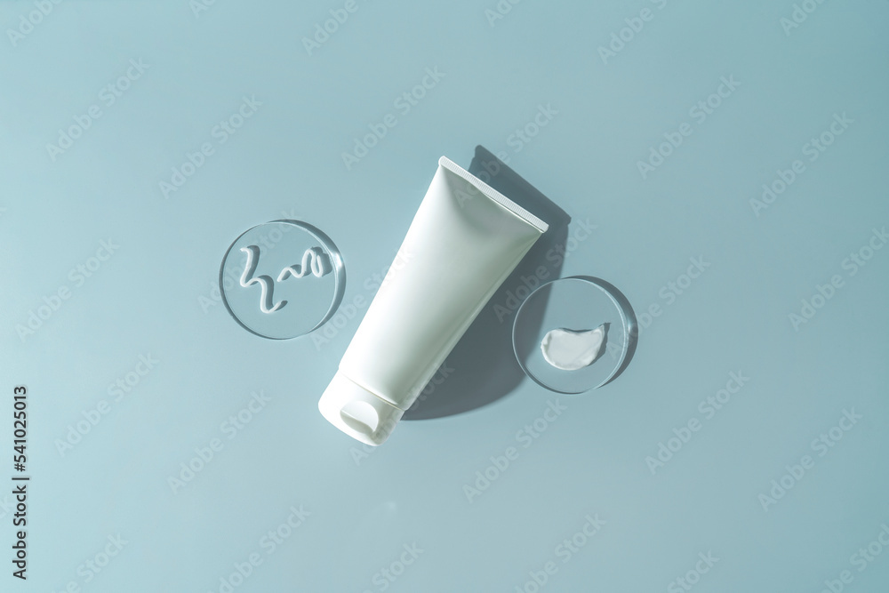 A white smudge of face cream on round podiums. Cosmetology and pharmaceuticals concept.