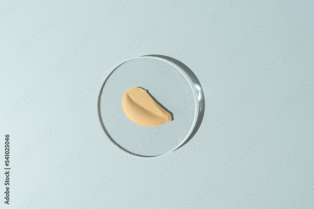 A face tonal cream smudge lying on a glass plate. Cosmetology and makeup concept