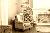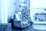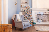 Classic Christmas decorated interior room, New year tree with silver decorations. Modern blue classical style interior design apartment with fireplace and armchair. Christmas eve at home.