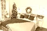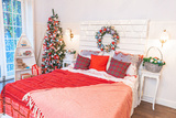 Classic interior room with Christmas tree and traditional white red decorations. Modern clean white classical style interior design apartment bedroom. Christmas eve at home. Minimalist home design.