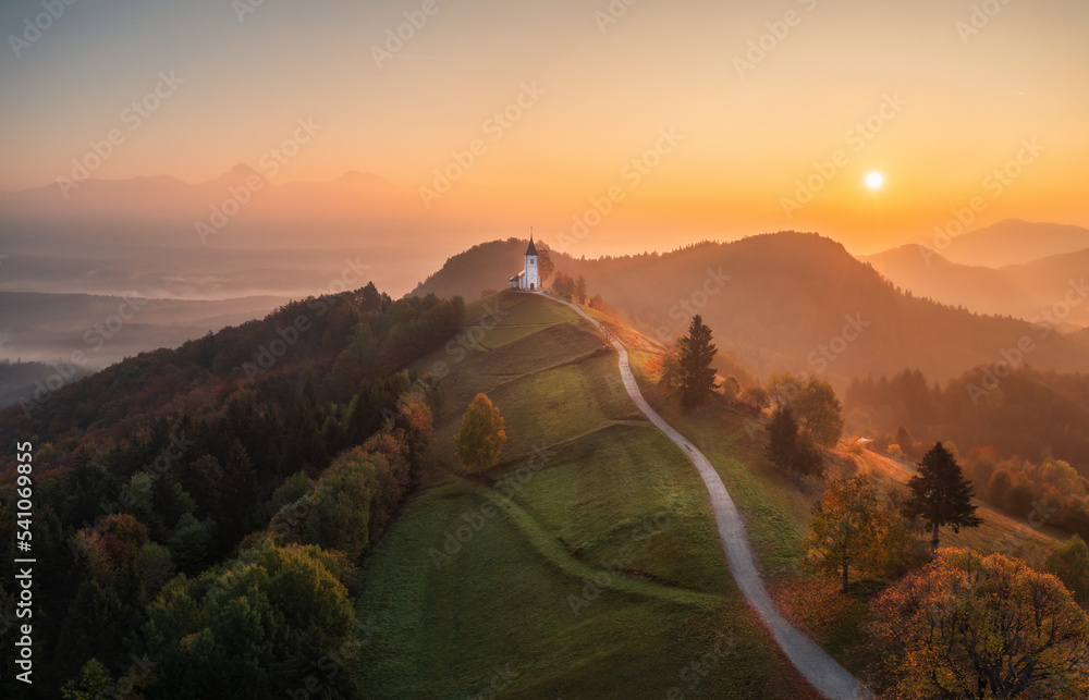 Aerial drone view of small beautiful church on top of a mountain in Slovenia at dawn. Beautiful autumn morning landscape