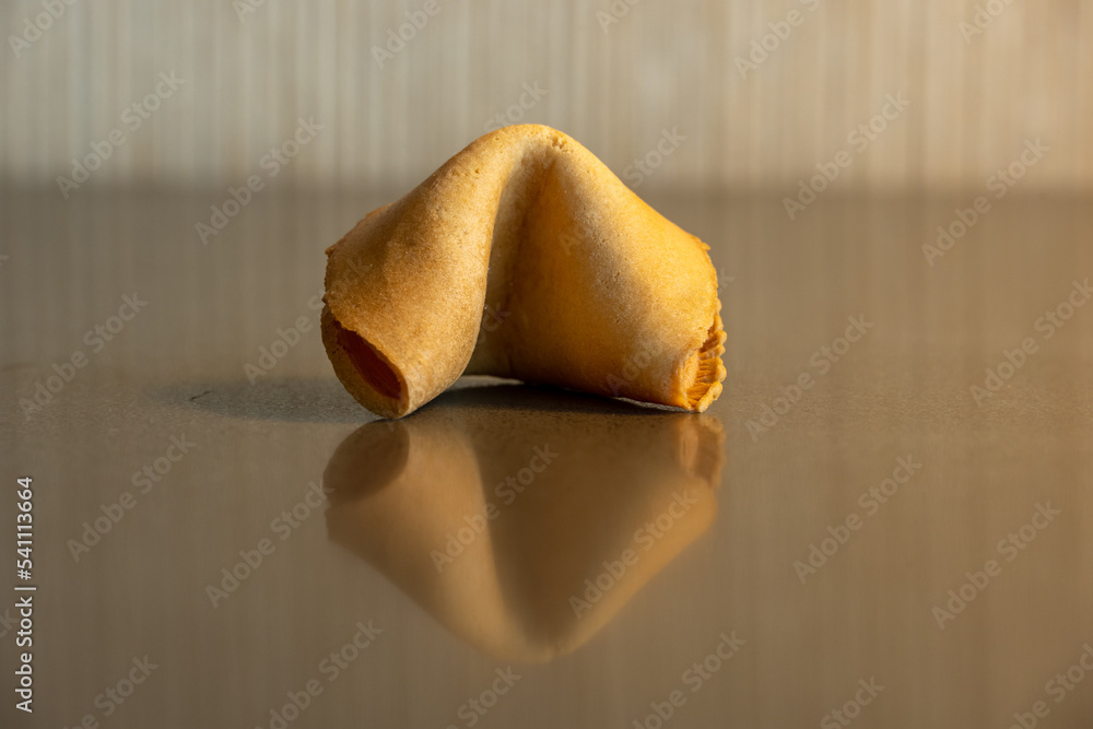 Single Fortune Cookie Sits Centered On Reflective Counter