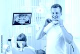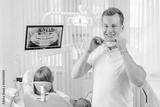 Doctor dentist smiling without medical mask in dental clinic on backdrop with medical equipment, x-ray dental and patient. Smile healthy teeth concept