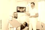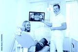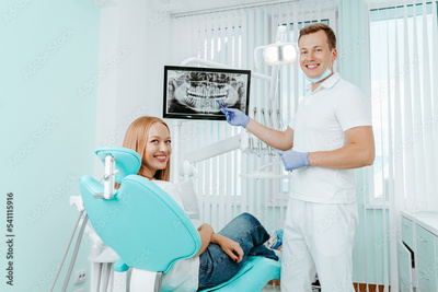 Doctor dentist and woman patient smilling in dental clinic. X-ray on digital screen in stomatology clinic with medical equipment. Smile healthy teeth concept