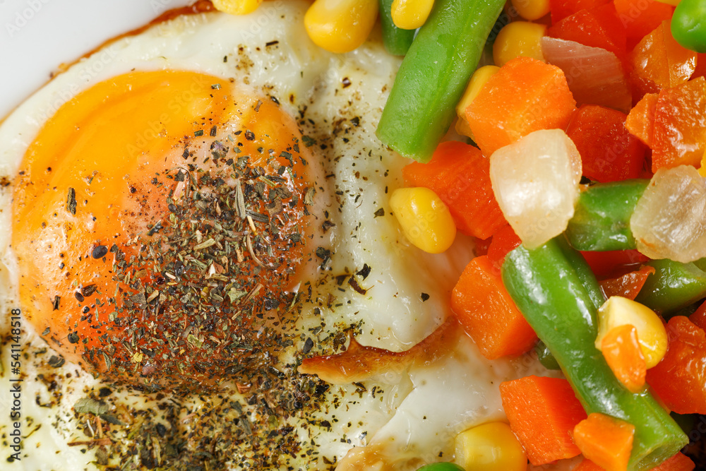 Fried eggs with vegetables. Traditional delicious breakfast and lunch.