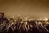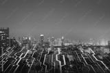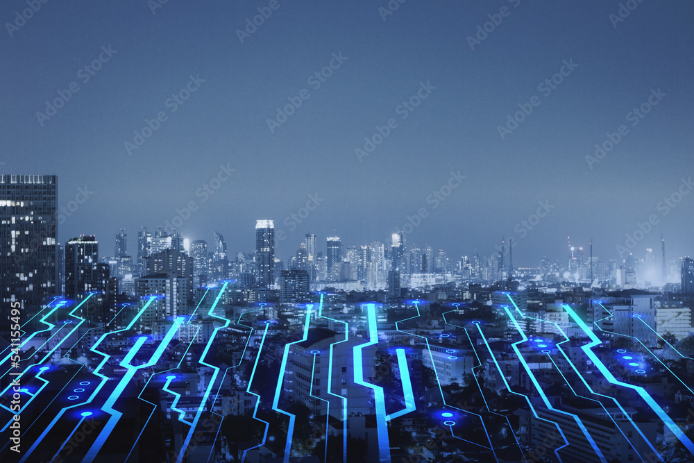 Abstract night circuit city background with mock up place in sky. Smart city, ai and digital transformation concept. Double exposure.
