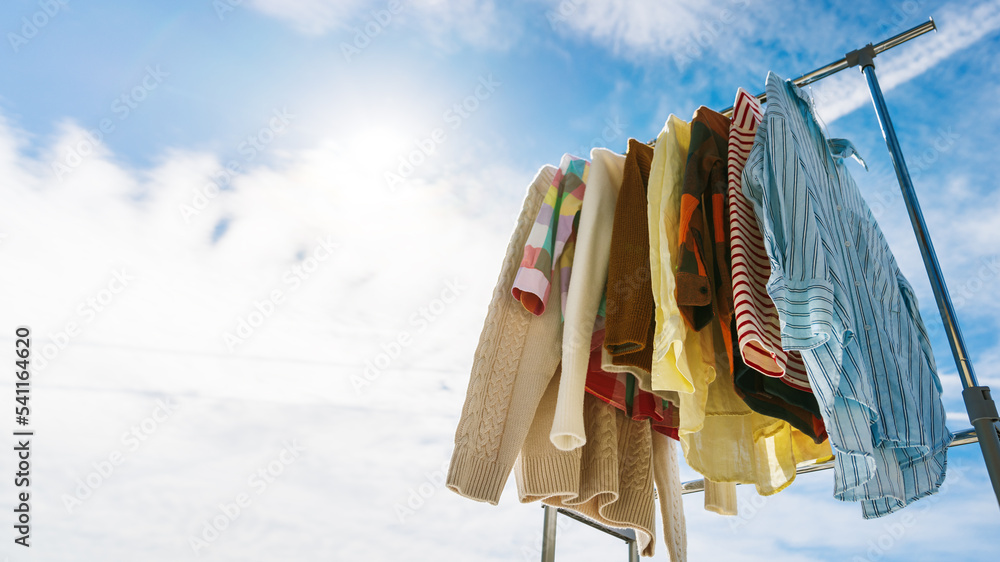 Low angle view at colourful clothes hanging on rail against blue sky.