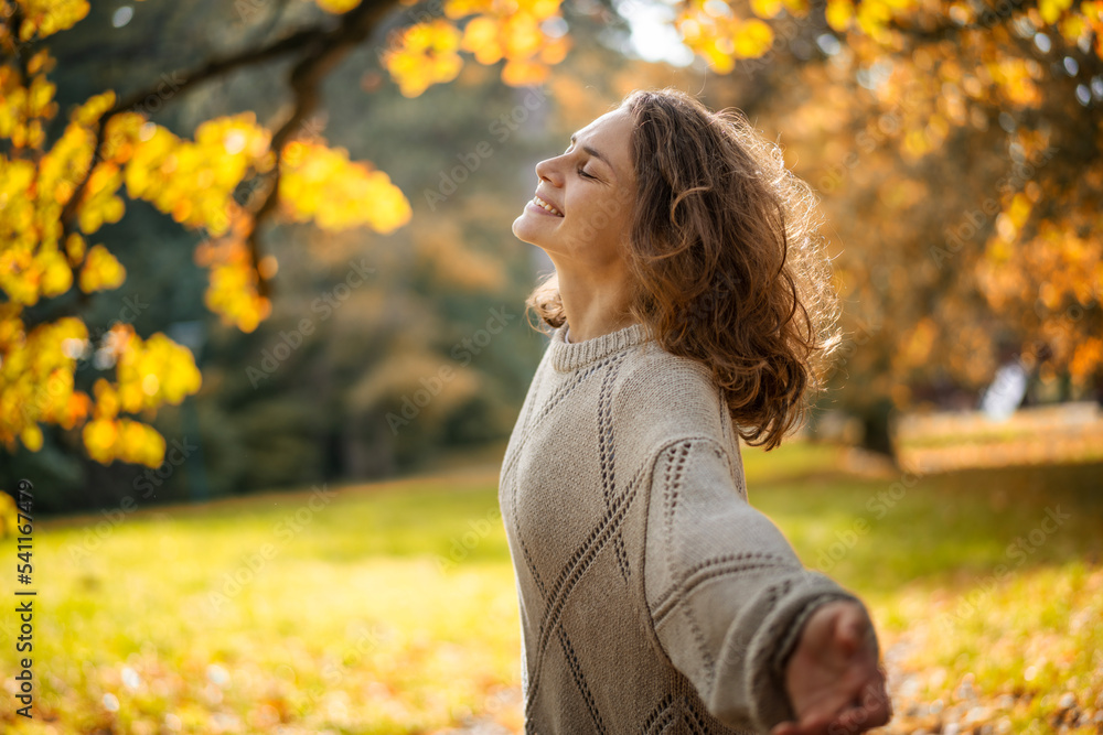 Beautiful happy caucasian young woman in beige sweater enjoying nature and fresh circling with outstretched arms in autumn park