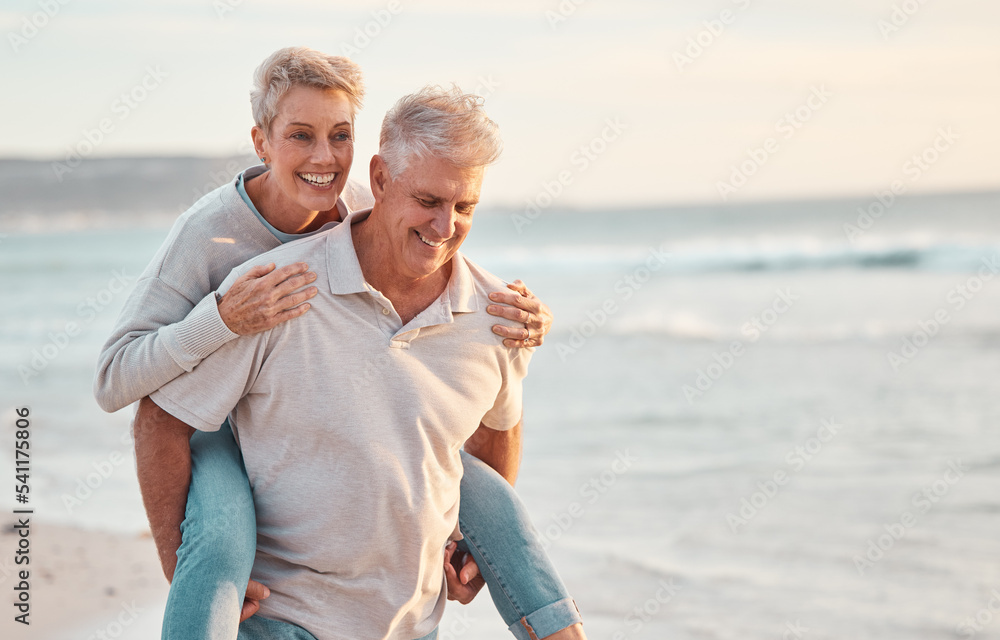 Love, beach and piggyback with a senior couple walking by the sea or ocean while on a date in summer together. Nature, earth and water with an elderly man and woman pensioner taking a walk on a coast