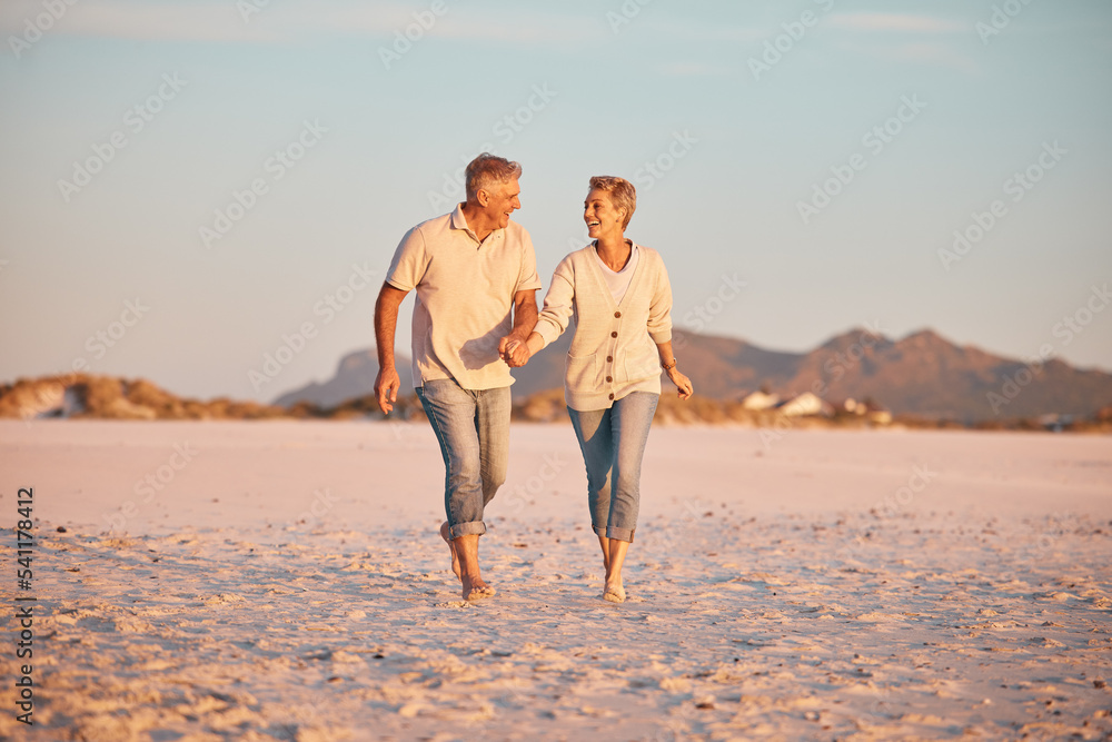 Senior couple on beach, hand holding during retirement and travel, holiday together with love and care outdoor. Elderly, man and woman, romantic walk on the sand, blue sky and summer vacation.