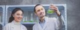 Male scientist is holding green substance in glassware. Two people working in eco biology laboratory with Successful result. Concept of Eco and natural experiment and reserch wide screen and panorama.