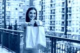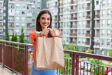 Woman delivering food in paper bag.Female volunteer holding groceries in the house porch. Delivery food service at home. Courier delivered the order no name bag with food.
