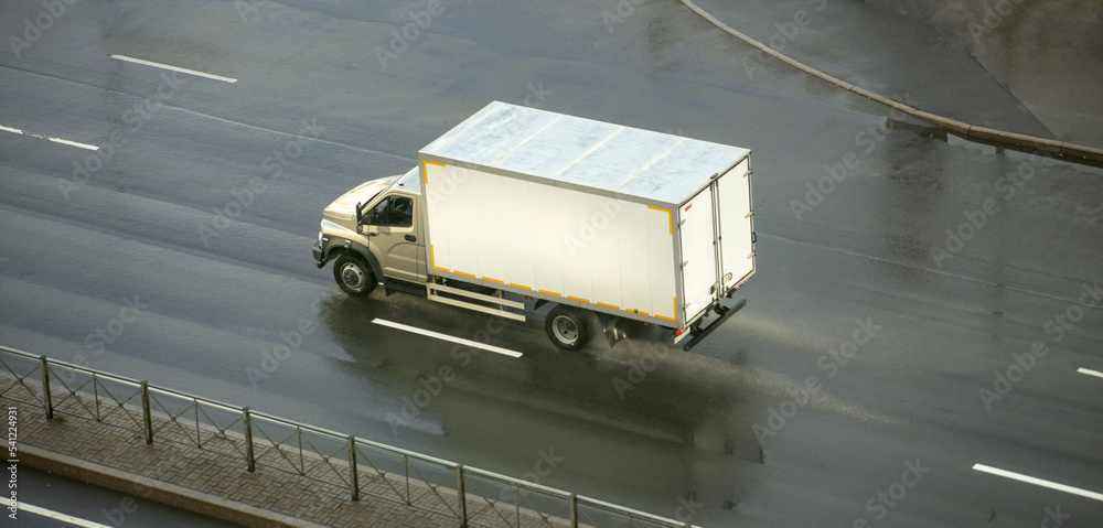 A truck with a white rectangular body is driving on an asphalt road. A clean body for applying the logo to the car.Delivery of goods by car. Courier delivery of bulky parcels.